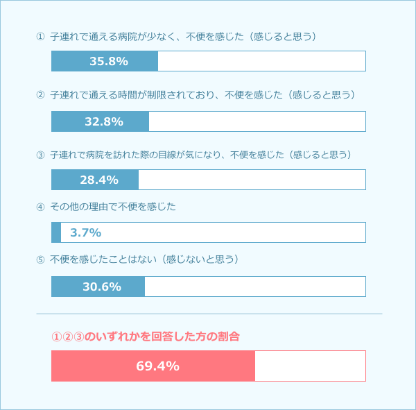 また同時に、「二人目不妊」の方は、二人目特有の悩みがあることも分かりました。 それは、不妊治療専門クリニックに関する悩みです。 その悩みは、「子連れで通える病院が少ない」、「子連れで行ける時間が制限されている」といったものです。